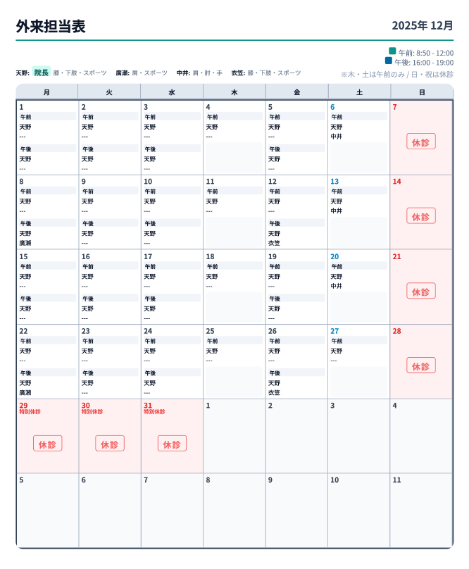 | 診療時間 | 月 | 火 | 水 | 木 | 金 | 土 | 日・祝 |